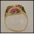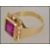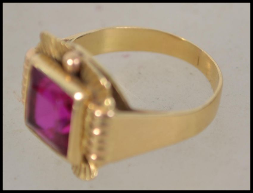 A early 20th century Art Deco 18ct gold ring set with a square cut ruby in an Egyptian revival style setting.  Mark to shank. Ruby measures approx 8mm x 8mm. Tests 18ct gold plus. Size  Q, Weight 6.7g