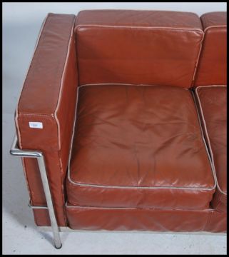 After Le Corbusier. An early 'LC2 ' type red / tan leather and chrome 2 seat sofa settee The polished chrome tubular frame with red leather seat of angular form. (see illustrations). Measures height 70cm x width 130cm x depth 70cm.