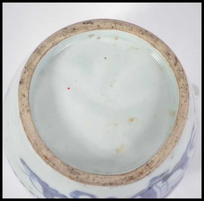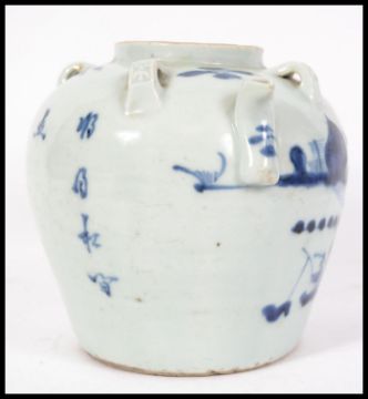 A Chinese blue and white Kang-xi period ceramic teapot decorated with trees, boats, waves and mountain scenes, character marks to the sides with clear base. Measures 15cm high.