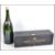 A 20th century large Moet & Chandon champagne bottle box in black with gilt notation complete with the bottle ( empty ). Measures 53cm wide.