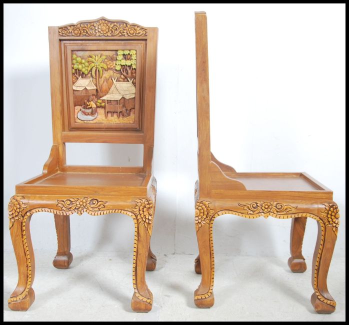 A pair of 20th century carved hardwood hall chairs having carved in relief panel back rests with scenes of people and villages raised over panel seats and carved legs