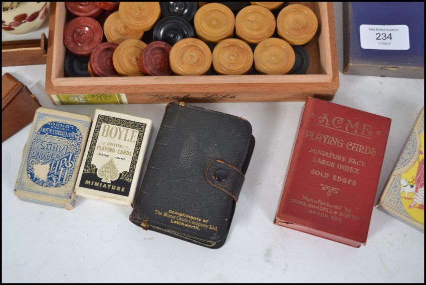 A collection of vintage 20th century playing cards together with draughts, 19th century miniature bone dominoes please see images.