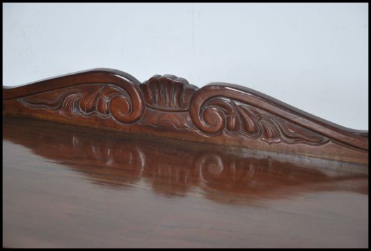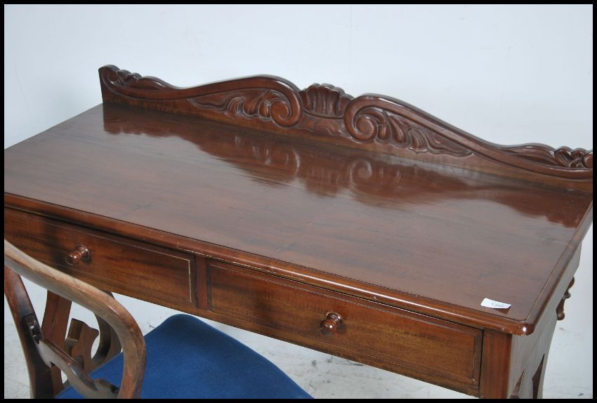 A good Regency revival solid mahogany writing table desk raised on lyre shaped supports with central turned stretcher together with a rosewood 19th century balloon back desk chair. Measures 88cm high x 106cm wide x 50cm deep.
