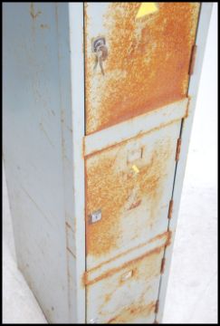 A large 20th century upright Industrial factory metal locker cabinet having multiple locker door in the original grey finish. Measures height 178cm x width 31cm.