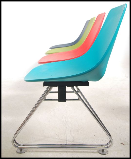 A contemporary Charles & Ray Eames style 4 seat bench by Merryfair having chrome DSW style eiffel supports with multicoloured seats atop. Matching 2nd bench in lot 1019.