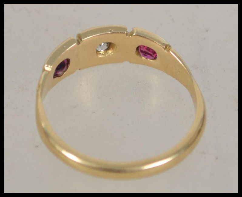 An early 20th century 18ct gold ruby and diamond ring with central star set diamond (approx  5pts) flanked by two rubies. Marked 18ct tests 18ct gold. Weight 3g. Size L .
