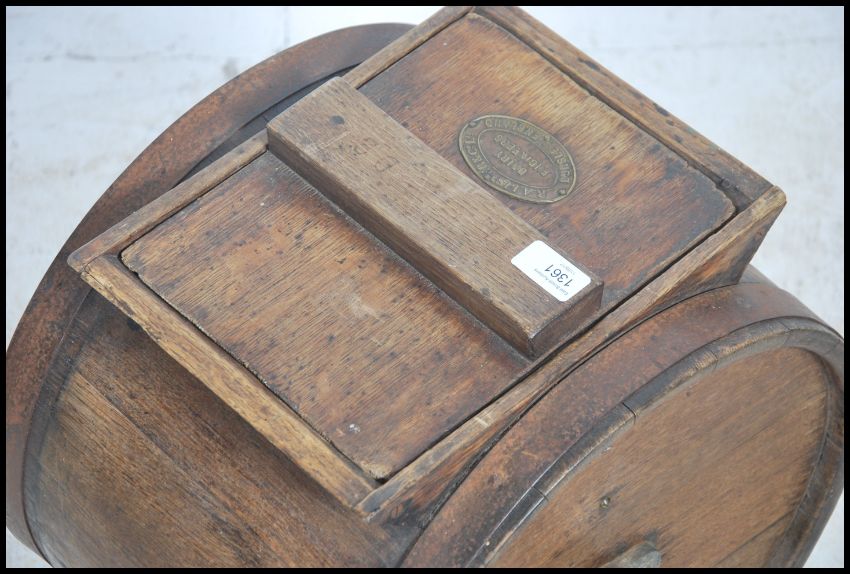 An early 20th century oak butter churn having central barrel on cast metal supports with handle. Measures 44cm high x 31cm wide x 49cm deep.