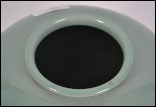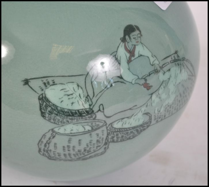 A 20th century Oriental Celadon crackle glaze vase of bulbous form depicting a maiden with character marks to side. Measures 20cm high.