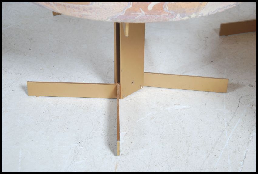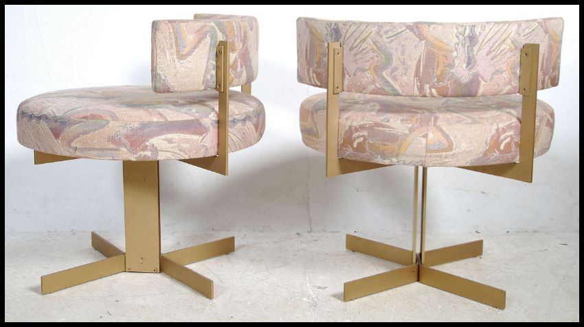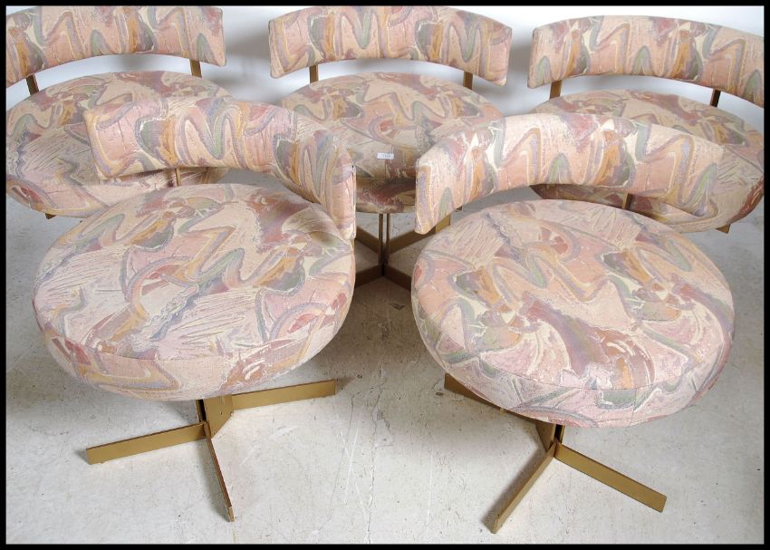 A set of 5 retro 1970's Merrow Associates style cocktail lounge chairs being raised on gilt metal x-frame bases with circular overstuffed seats and half moon back rests. Measures height 67cm x width 62cm.