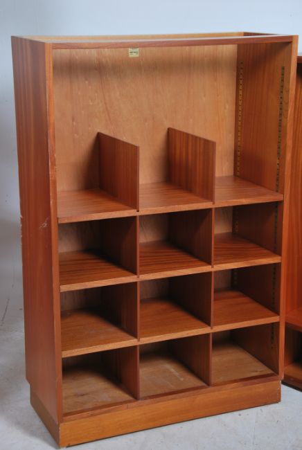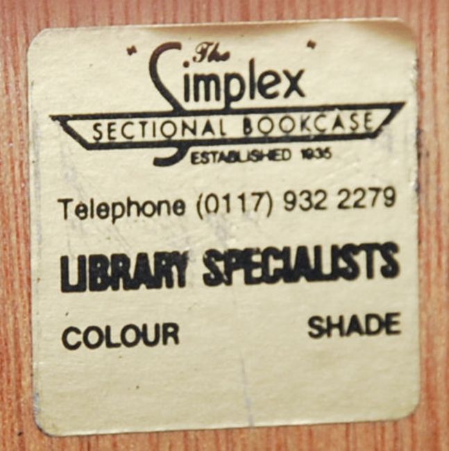 A large twin modular teak wood bookcase by Simplex. The double section body with adjustable shelving set within complete with makers plaque for Simplex of Bristol