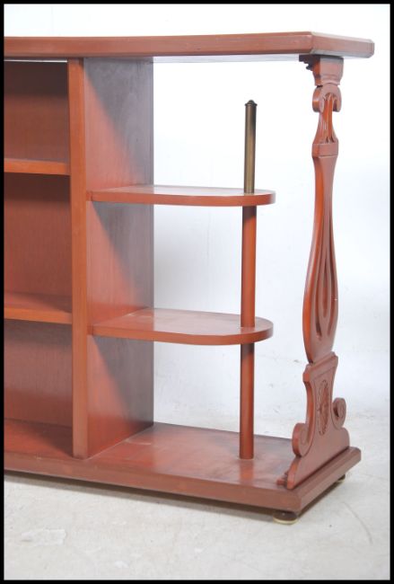 A Regency style mahogany open window bookcase cabinet having lyre shaped end support with bookcase shelves all raised on bun feet. Measures 79cm high x 109cm wide x 31cm deep.