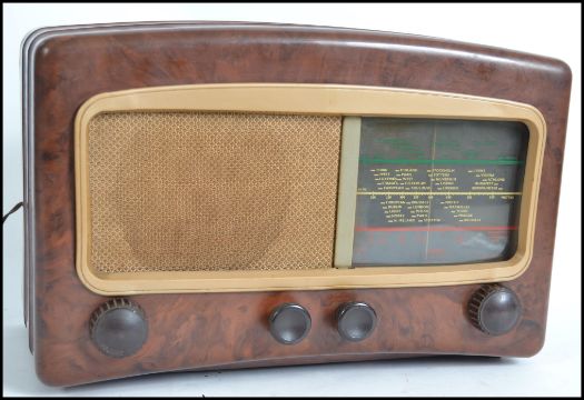A vintage 1930's Art Deco marbled brown bakelite radio with decorative facia and rounded dials by Cossor.