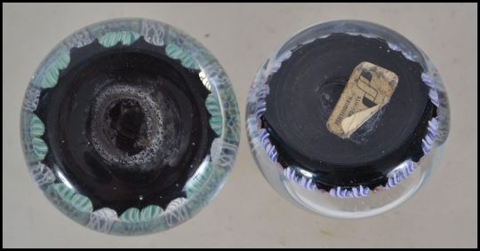2 believed early 20th century millefiori paperweights both with black glass inner bases to the canework  each with spiral twist sections, one being marked for Crieff Perthshire