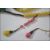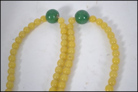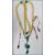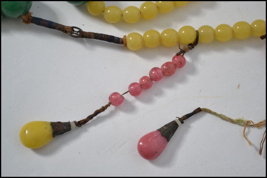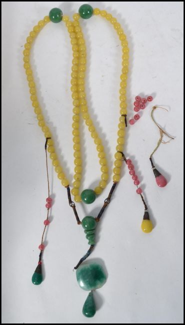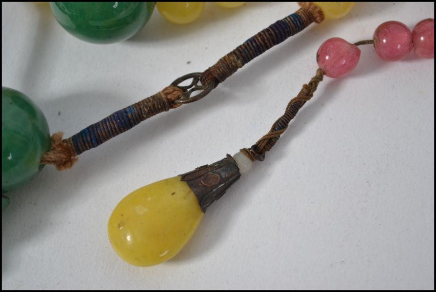 A Chinese Qing dynasty peaking glass court necklace. The necklace consisting of yellow green and pink peaking glass beads, with tassels terminating in a green pink and yellow peaking glass drops. The necklace constructed with twisted wound silk and metal round spacers and cone metal finial holders. Measures approx 150cm