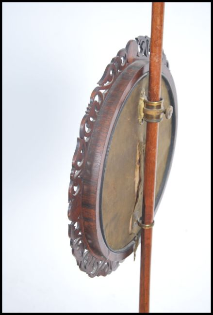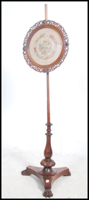 A good 19th century Regency rosewood fire screen pole of Irish / Scottish origin. Raised on terraced base with hairy paw feet having central pole with adjustable needlepoint screen finished with latticed worked borders. Measures 135cm high.