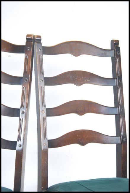 A mid 20th century beech and elm dining suite by Ercol, consisting of Sideboard together with a draw leaf dining table and six ladder back dining chairs two being carvers. Measures 74cm High x 115cm Wide x 71cm Deep.