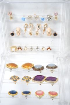 A large collection of costume jewellery earrings to include yellow and white metal examples being stone set, enamel set, glass set, roundels, leaf style, faux pearl and many more complete with display stands