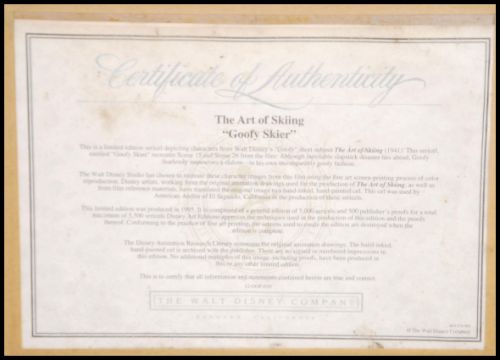 A framed limited edition Disney collectors sericell depicting Goofy and entitled The Art of Skiing. Framed and glazed with certificate of authenticity to verso. Measures 65cm high x 30cm wide.