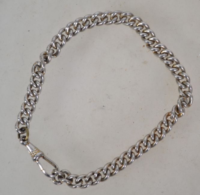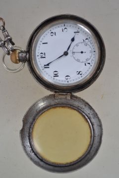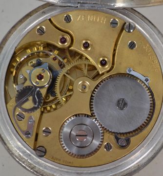 A silver hallmarked open faced crown wind pocket watch. Inset Zenith movement with Birmingham hallmarked case, makers AL Dennison for 1931. Complete with white metal albert chain and protective case. Total weight 123.7g