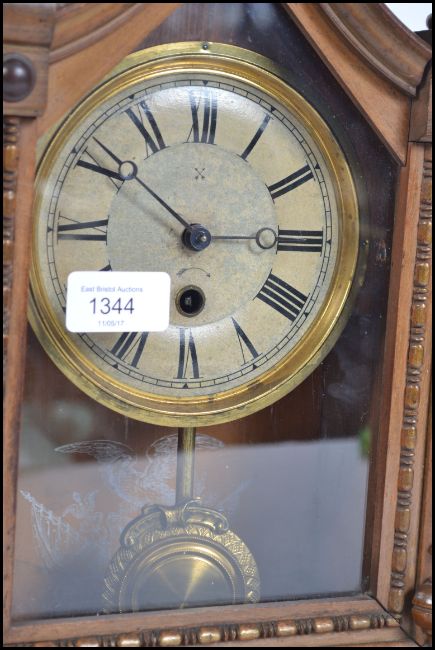 A Victorian German Wurttemberg gingerbread clock having turned wood finials and faceted hands with key and pendulum.