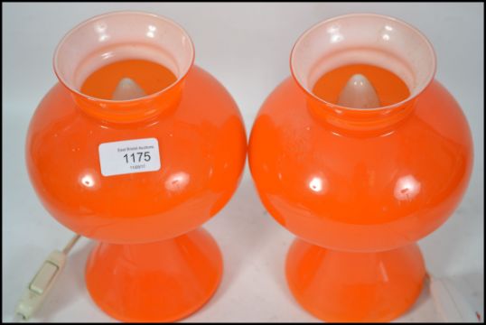 A good pair of 1970's two two orange glass table lamps of mushroom form. Orange outers white inners complete with electrics etc