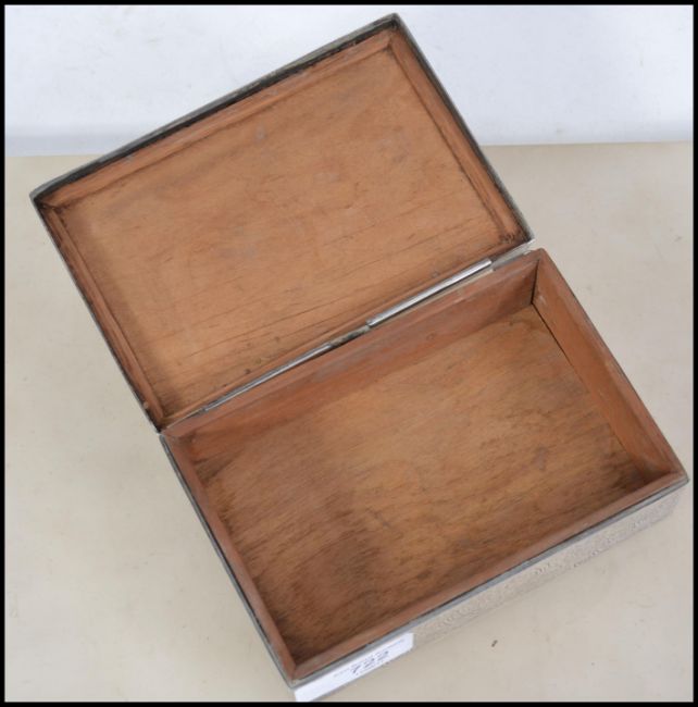 An Egyptian silver table top cigarette box chase decorated with geometric borders and ornate chase decorated panels. Weighs 368.2 grams and measures 14cms wide.