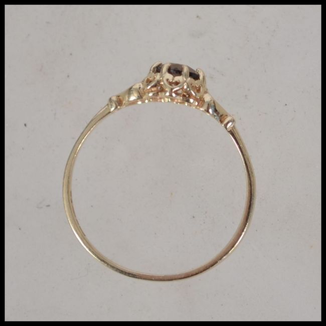 A 9ct gold hallmarked gold single stone ring. The ring set with lattice worked mount, single smokey quartz stone to centre. Hallmarks for London 1991, maker SJ. Weight 1.2g size R.