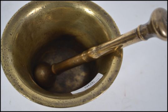 A good heavy  18th century bronze pestle and bell shaped mortar. Measures 10cm high.