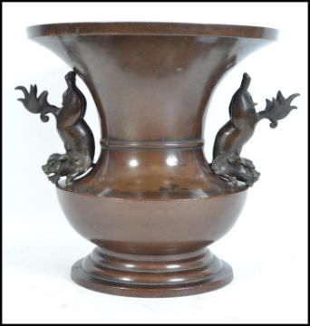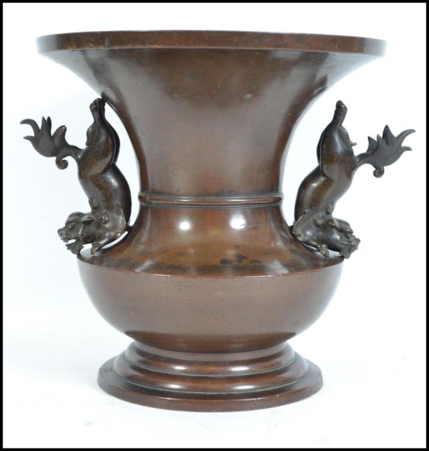 A 19th century large Chinese bronze temple vase. Of baluster form with twin handled fu-dog sides to the waisted centre having flared top with circular foot to the vase