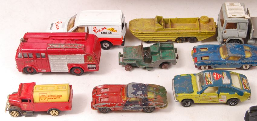 A large quantity of loose Dinky, Corgi & various branded diecast model vehicles to include; Dinky Fire Engine, Jeep, Matchbox Y12, Corgi Ford Escort, Chevrolet, Troop Transporter etc.