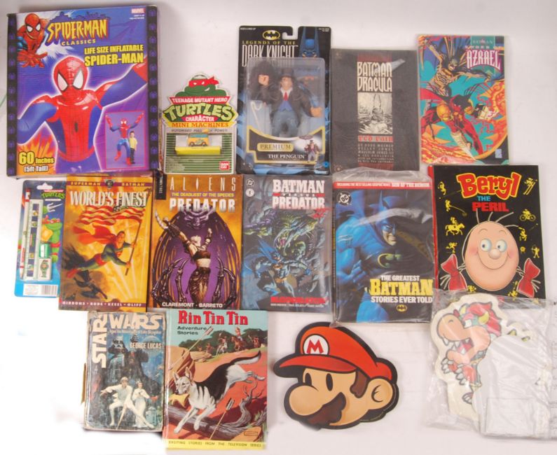 A collection annuals and books to include; George Lucas' Sat Wars, Rin Tin Tin Adventure Stories, Beryl The peril, The Greatest Batman Stories Ever Told, Batman & Dracula etc. Also to include 5ft inflatable Spiderman & Dark Knight card back figure.