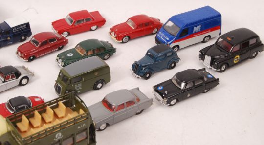 A collection of 22x original Corgi Classic diecast model vehicles to include; Bedford Gas van, Hackney Carriage, Triumph, Jaguar, Ford, Morris J Type Post Office van, Porsche etc