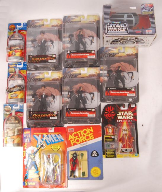 A collection of 007 James bond & X-Men & Star Wars carded figures to include; 5x Stars Dragon 007 figures form Tomorrow Never Dies & Goldeneye, Micro Machines Star Wars Action Fleet, X-Men Storm figure, Star Wars Episode I Amidala figure.