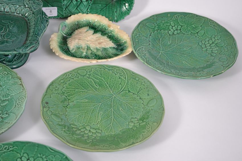 A good collection of 19th century Majolica wares to include footed bowl with central leaf design, pair of twin handles bowl with raised edges and leaf design, a series of 8 plates with varying leaf designs and 2 white and green ash leaf design bowls with pierced ends. The largest measures 26cm high.