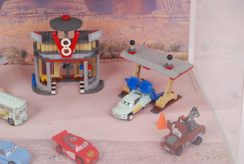 A Lego ' Cars ' Disney shop display cabinet. Featuring set 8487 ' Flo's V8 Cafe .' 100% complete and made for display. With lights (batteries appear flat). Approx 38cm x 59cm x 39cm
