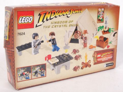 A Lego Indiana Jones set 7624 ' Jungle Duel '. Factory sealed, unopened. Box has a natural split to one side, but all contents are still sealed within.