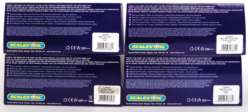 A collection of 4x original contemporary 1/32 scale Scalextric Sport Digital plastic racing slot cars to include; C2567D Mercedes CLK DTM, C2569D Opel V8 Coupe, C2569D Opel Coupe & C2691D Dodge Viper . All within their original plastic cases.