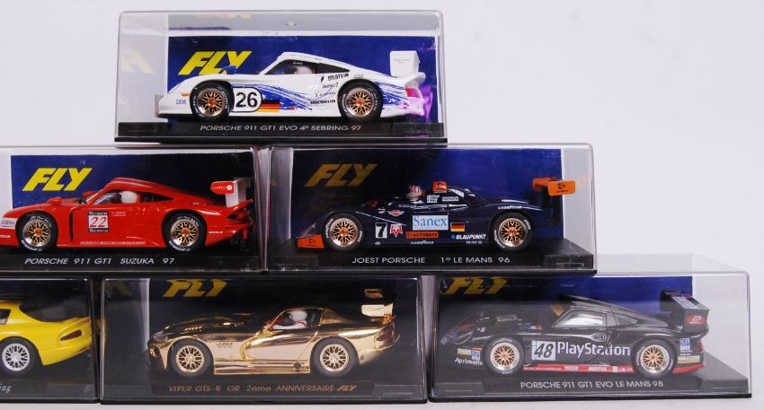 A collection of 6x original contemporary 1/32 scale Fly plastic racing slot cars to include; A51 Porsche GT1, E1 Viper, E7 Viper Oro, A55 Porsche Gt1, A34 Porsche Gt1 & A41 Joest Porsche. All within their original plastic cases.