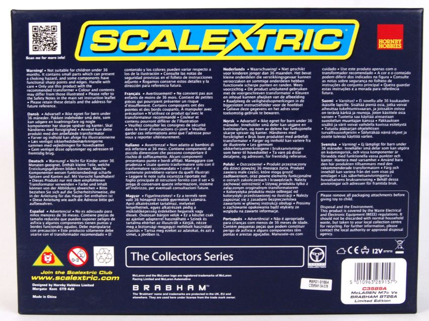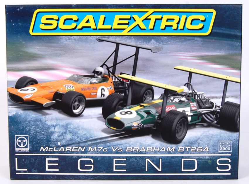 An original contemporary 1/32 scale Scalextric McLaren M7c Vs Brabham BT26A Limited Edition Legends boxed set C3589A (no. 1278 of 3000). Mint with original plastic inner cover.