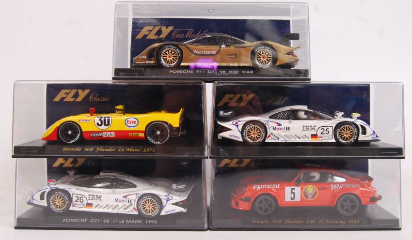 A collection of 5x original contemporary 1/32 scale Fly Car Model plastic racing slot cars to include; C44 Porsche 908, A71 Porsche GT1, A72 Porsche GT1, 88340 Porsche 911 & A73 Porsche GT1 98. All within their original plastic cases.