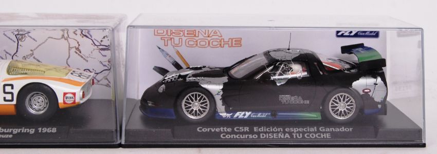 A collection of 2x original contemporary Fly Car Model 1/32 scale plastic model slot cars to include; 88255 Porsche Carrera 6 & 99026 Corvette C5R. Both within their original plastic cases.