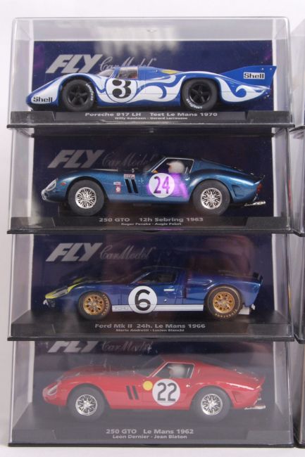 A collection of 8x original contemporary 1/32 scale Fly plastic racing slot cars to include; 88206 Porsche 917, A142 Ford Capri, 88211 250 GTo, 88217 BMW M3, 88193 Ford MKII, 88220 Chrysler, 88208 250 GTO & 88141 Porsche 934. All within their original plastic cases.
