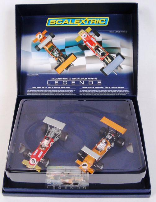 An original contemporary 1/32 scale Scalextric Team Lotus Type 49 Vs McLaren M7c Limited Edition Legends boxed set C3544A (no. 2010 of 3000). Mint with original plastic inner cover.