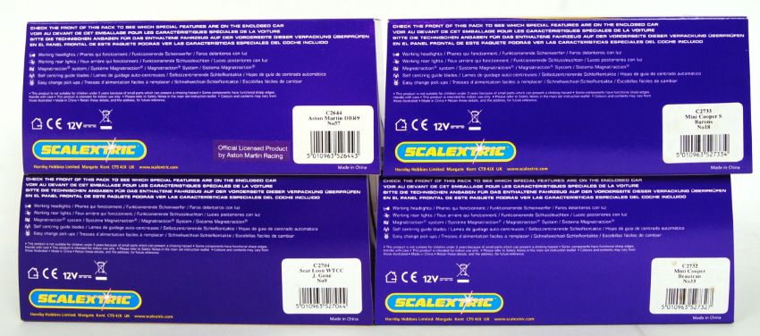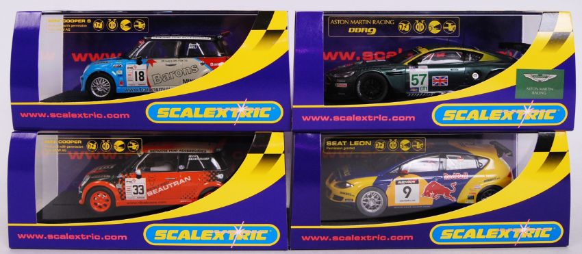 A collection of 4x original contemporary 1/32 scale Scalextric plastic racing slot cars to include; C2733 Mini Cooper S, C2732 Mini Cooper no33, C2644 Aston Martin DBR9 & C2704 Seat Leon WTCC. All within their original plastic cases.