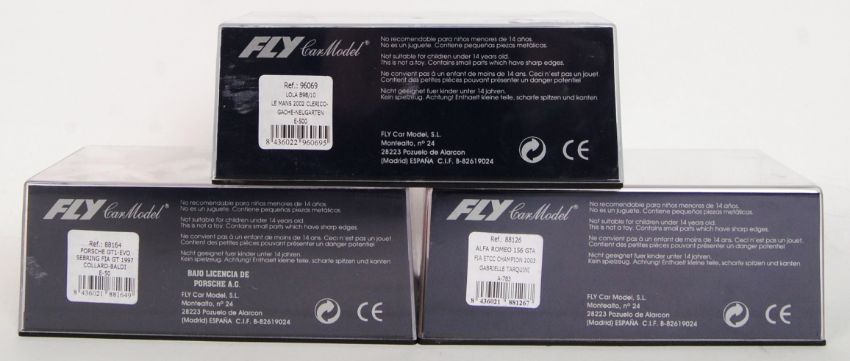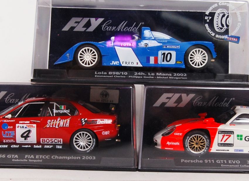 A collection of 3x original contemporary 1/32 scale Fly Car Model plastic racing slot cars to include; E500 Lola B98, E50 Porsche GT1 Evo & A783 Alfa Romeo. All within their original plastic cases.