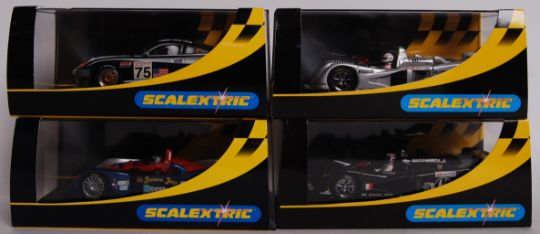 A collection of 4x original contemporary 1/32 scale Scalextric plastic racing slot cars to include; C2259 Cadillac LMP, C2258 Cadillac LMP, C2482 MG Lola & C2480 Porsche 911 GT3R. All within their original plastic cases.
