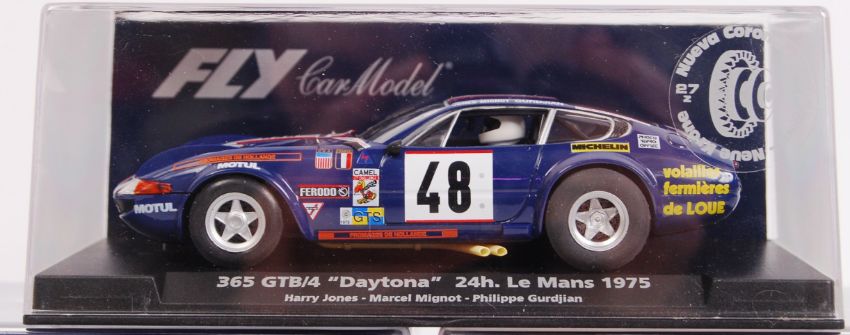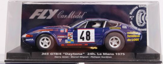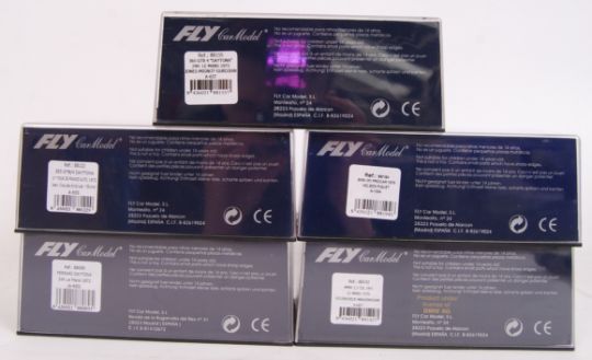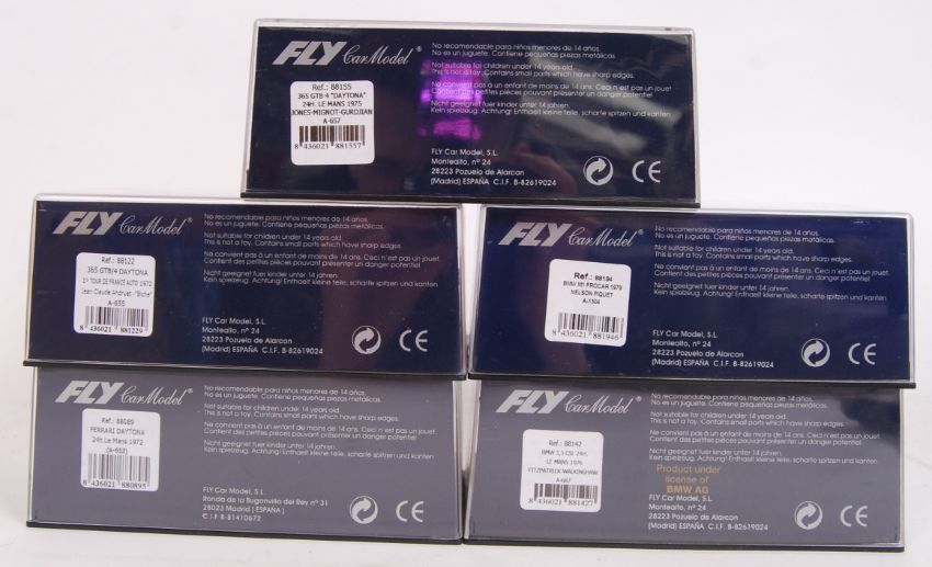 A collection of 5x original contemporary 1/32 scale Fly Car Model plastic racing slot cars to include; A657 Daytona, A655 365 Daytona, A653 Ferrari Daytona, A1304 BMW m1 & A687 BMW. All within their original plastic cases.