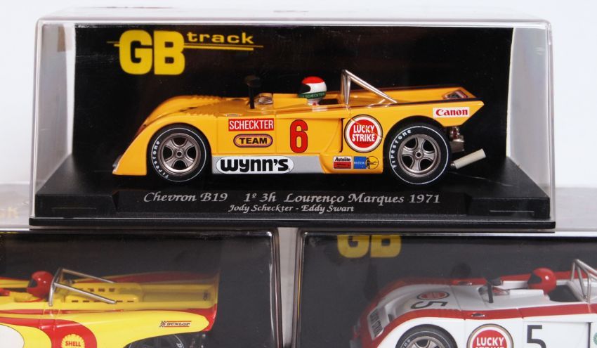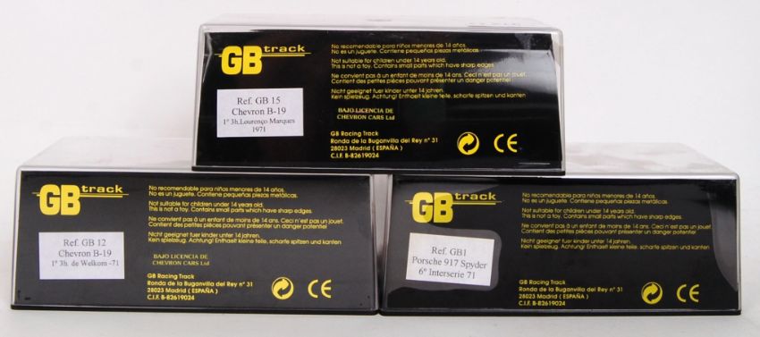 A collection of 3x original 1/32 scale GB Track plastic racing slot cars to include; GB15 Chevron B-19, GB1 Porsche 917 Spyder & GB12 Chevron B-19. All within their original plastic cases.