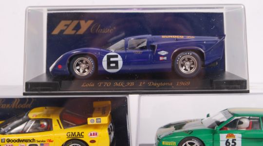 A collection of 5x original contemporary 1/32 scale Fly Car Model plastic racing slot cars to include; C31 Lola T70, A124 Corvette C5R, C11 Porsche 908 & A71 Porsche GT1 08. All within their original plastic cases.