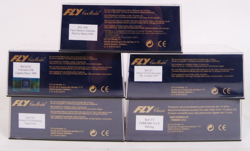 A collection of 5x original contemporary 1/32 scale Fly Car Model plastic racing slot cars to include; A88 Viper Barras, A121 Corvette C5R, C26 Ferrari 512 & C5 Ferrari 512 S. All within their original plastic cases.